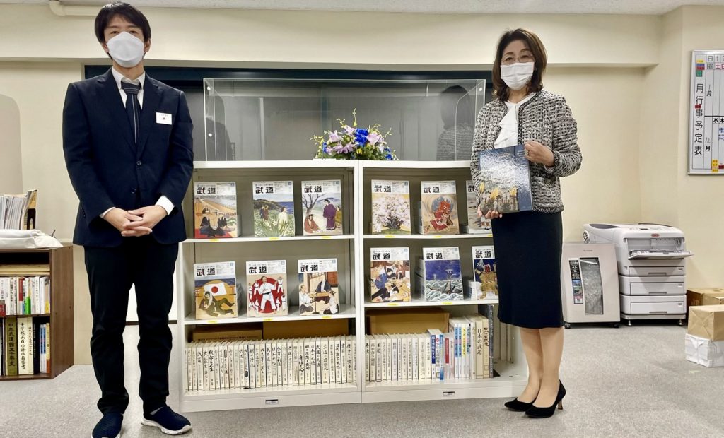 日本武道館出版広報課リニューアル 本日は、東京2020後改修されて新しくなった日本武道館地下の編集部には、新しい陳列棚が設置されていました。担当の長澤さんんと記念撮影。オリンピックイヤーのしめくくりの12月号表紙絵には、厄払いの鬼神ナマハゲをお描きしました。