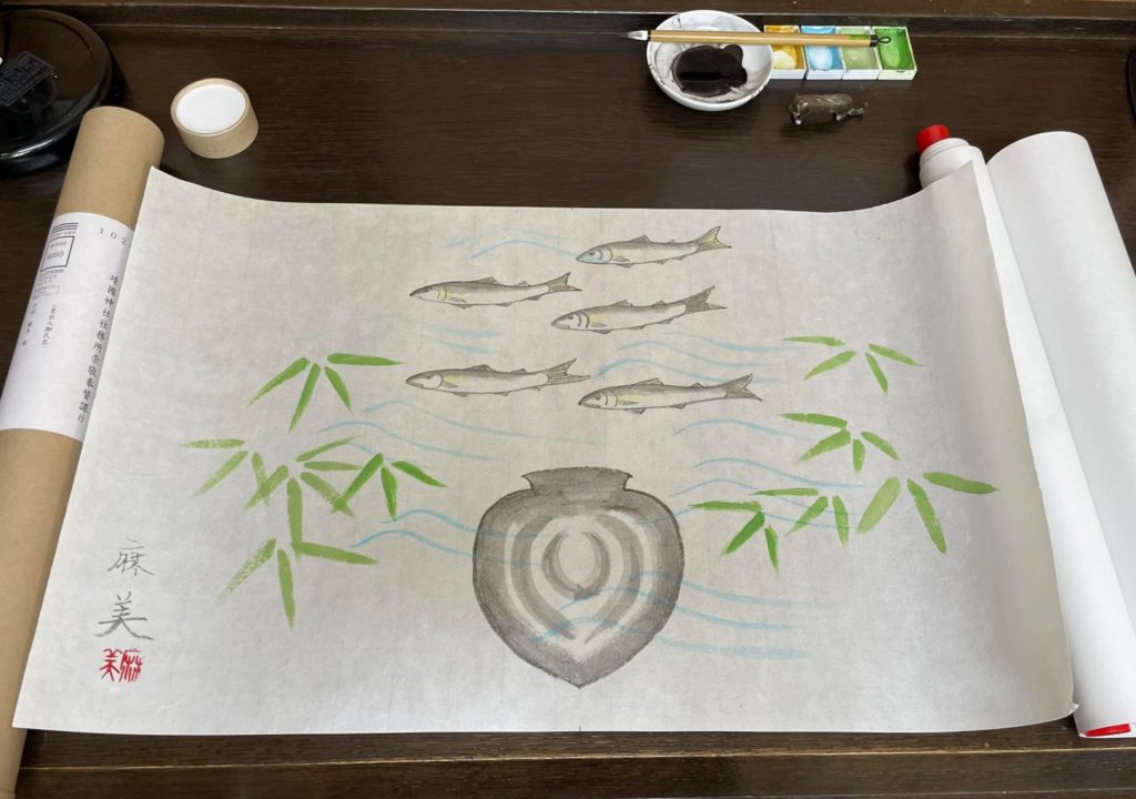 今年は「鮎と厳瓮(いつへ)」、和を尊ぶ建国の神話を画題に選びました。