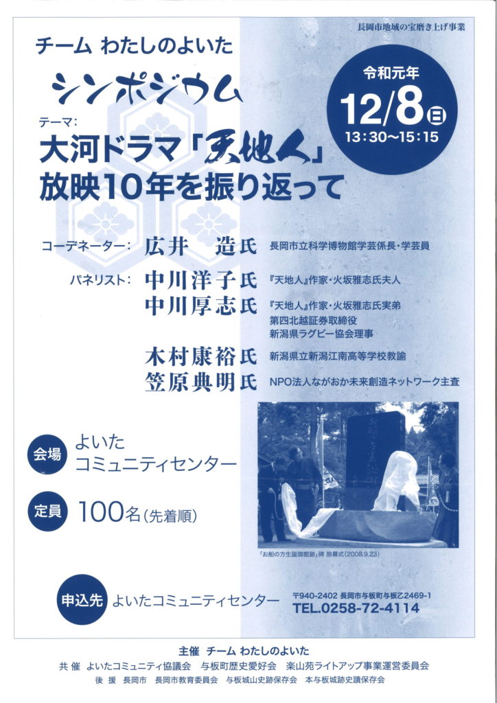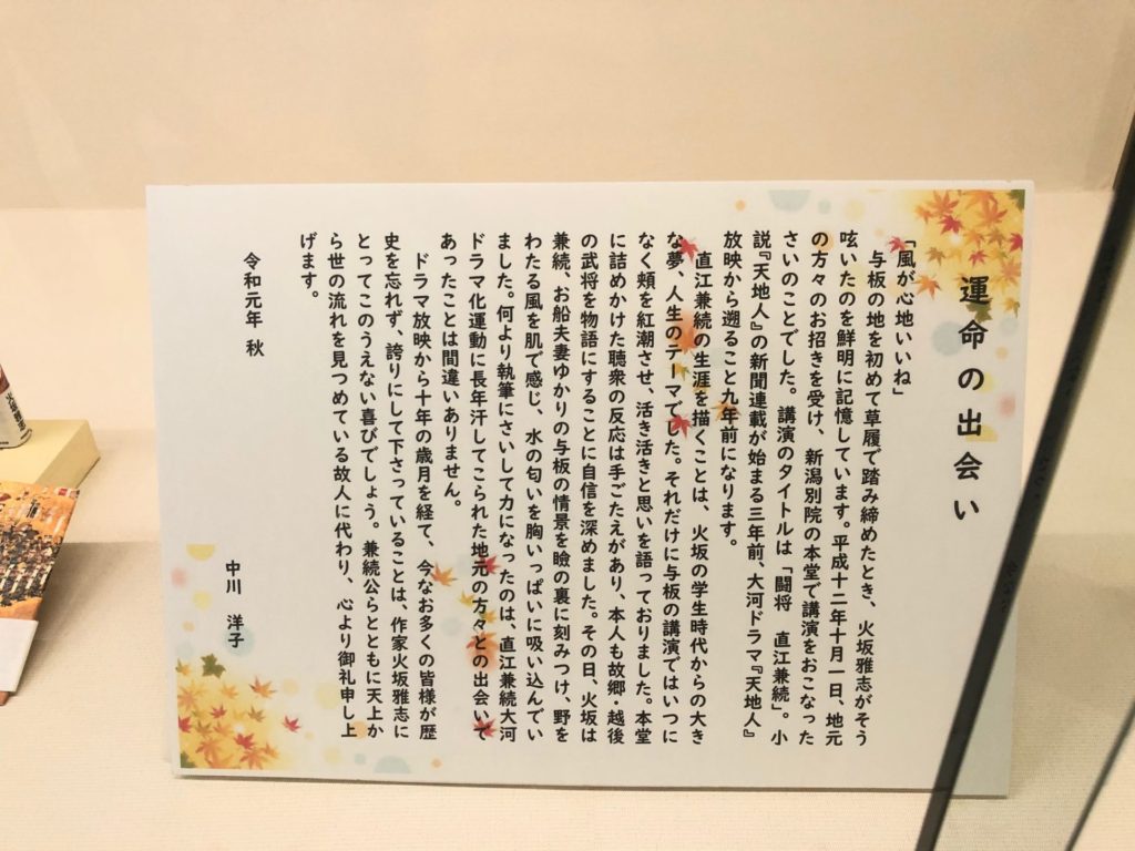 故・火坂雅志先生の奥様・中川洋子さんのご挨拶文、また、記念シンポジウムでの深いお言葉が、心に沁みた記念の催しでした。ゆかりの地のひとつ、ここ与板でときを経て、次世代へと継承されていく「天地人」の世界は永遠のものです。かけがえのない素晴らしい日々、天のとき、地の利、人の和を、昔も今も変わらず育て続けている皆さまのお心、忘れません。火坂先生、皆さま、長い間、ご指導くださり、ありがとうございました。これからのご活動も楽しみです。